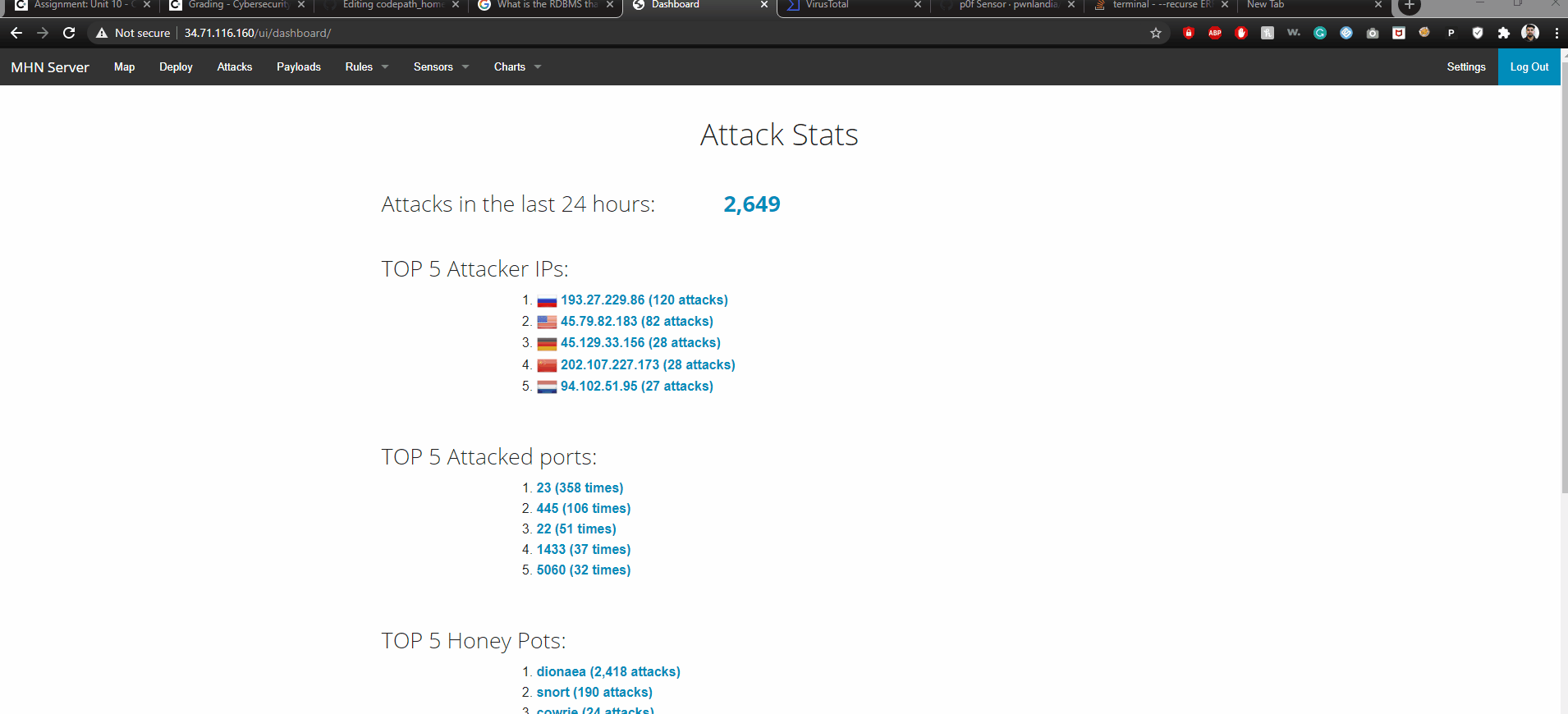In this project, I successfully deployed a honeynet using MHN-Admin, an efficient tool for managing and monitoring honeypots. The honeynet consists of three distinct honeypots: Dionaea, Snort Honeypot, and p0f. Dionaea is a malware capturing honeypot that traps malware exploiting network vulnerabilities and retrieves copies of the malicious software. Nort Honeypot is an open-source network intrusion detection system that performs real-time traffic analysis, capable of detecting various attacks and probes such as buffer overflows, stealth port scans, and OS fingerprinting attempts. Lastly, p0f honeypot utilizes passive OS fingerprinting techniques to determine the operating system and configuration properties of remote hosts, without generating suspicious network traffic.