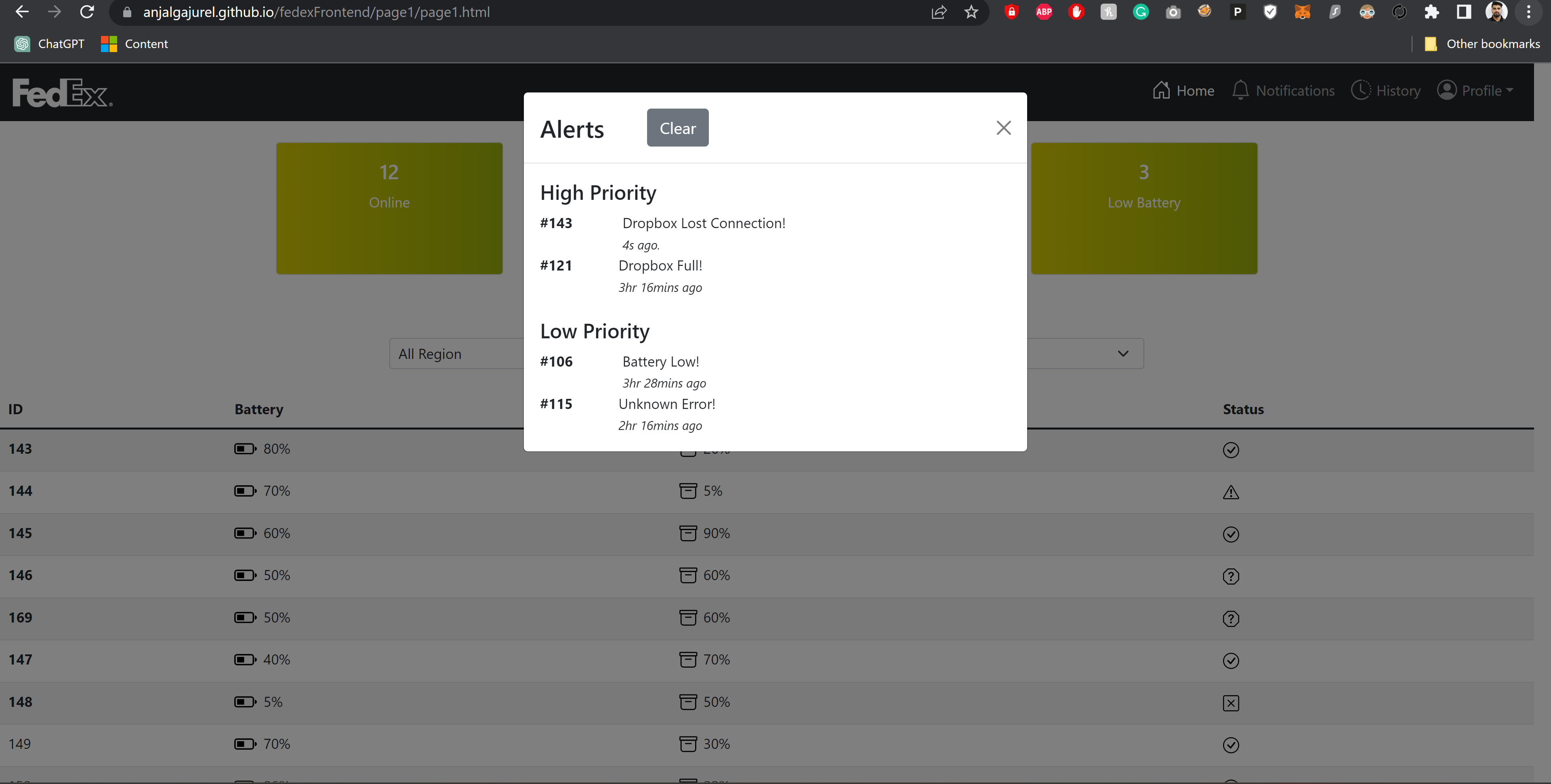 This front-end project focuses on designing and developing an interface for displaying dropbox diagnostics. It provides valuable insights into dropbox utilization, maintenance conditions, and usage patterns. Leveraging real-time data from FedEx systems, the interface enables users to identify over or underutilized drop boxes, detect boxes requiring maintenance or battery replacement, and make informed decisions based on the provided information.