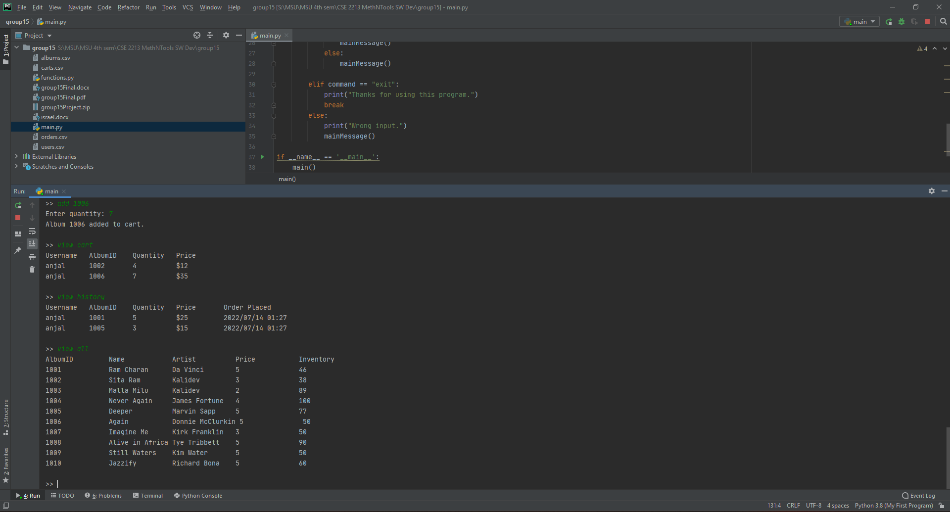 Made using Python, run in terminal, an e-commerce platform that deals with music album. Functionalities include viewing all items, shopping cart, check out, remove items, order history, edit accounts, session management and so on.
