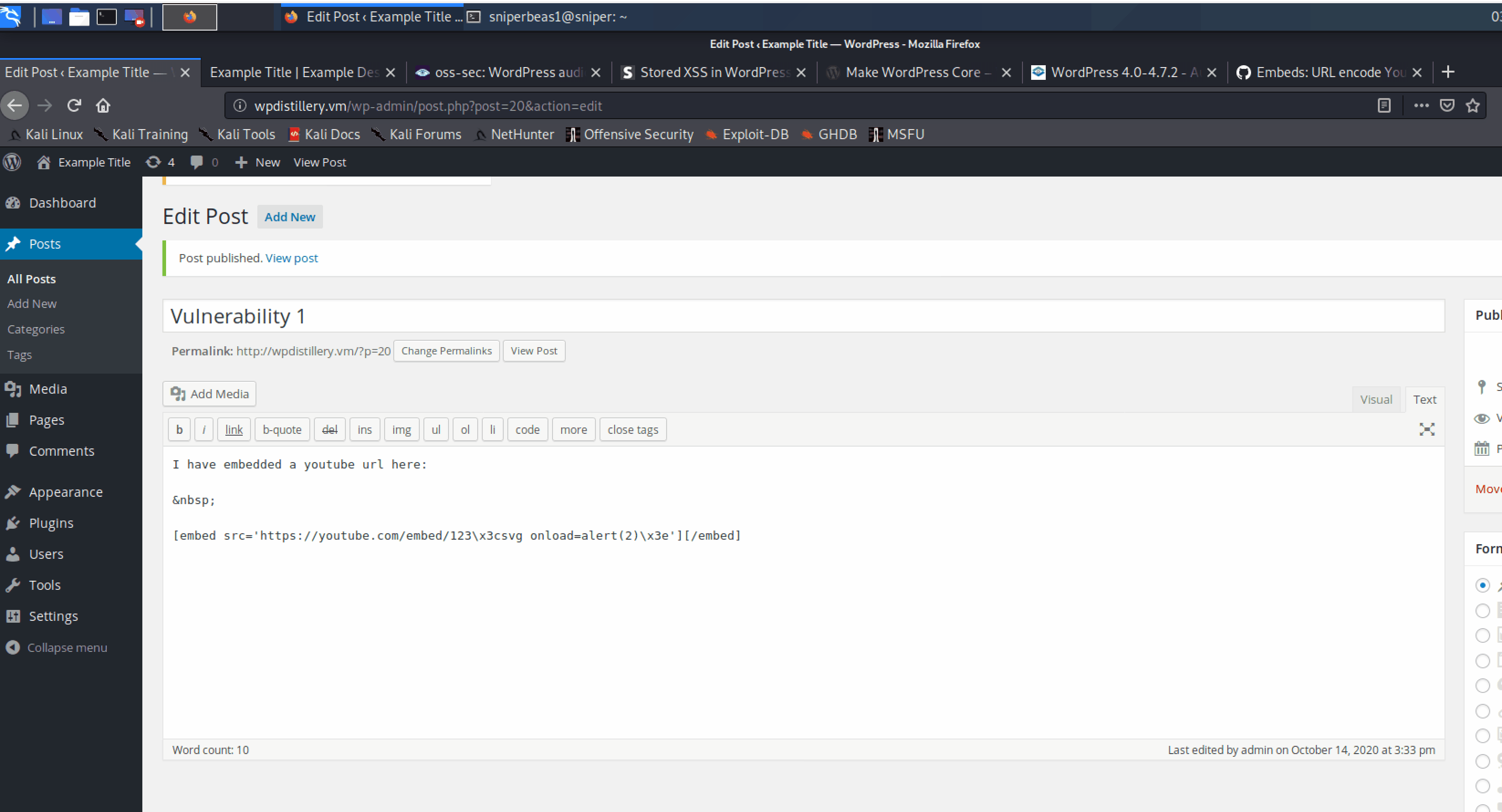 In this project, I undertook the task of finding, analyzing, recreating, and documenting vulnerabilities affecting WordPress, a widely used content management system (CMS). I focused on several vulnerabilities, including Authenticated Stored Cross-Site Scripting (XSS) in YouTube URL Embeds, Cross-Site Request Forgery (CSRF) in WordPress Connection Information, Unauthenticated View Private/Draft Posts, Persistent Cross-Site Scripting, and WordPress Username Enumeration.